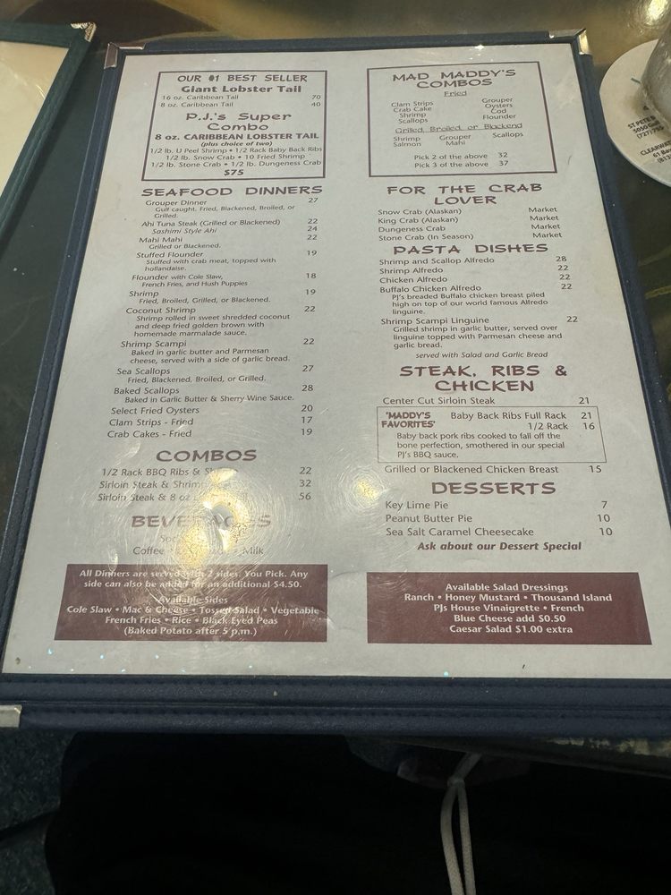 PJ's Oyster Bar, located in St. Pete Beach, FL, offers a diverse New American menu with a focus on seafood. With a variety of vegetarian options and a casual, welcoming atmosphere, it's the perfect spot for a meal with friends or family. Customers rave about the delicious food, with standout dishes like the Grouper sandwich, coconut shrimp, and the Pjs super combo receiving high praise. The clam chowder is a must-try, and the service, whether from Susan, Becky, or Billy/Mary Lou, is consistently excellent. The quirky decor and fun atmosphere add to the overall dining experience. Whether you're stopping in for lunch, dinner, or happy hour specials, PJ's Oyster Bar is sure to please your taste buds and leave you wanting to come back for more.